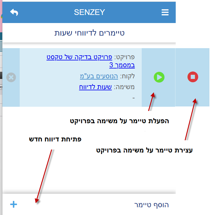 ניתן לדווח שעות דרך האפליקציה דרך טיימרים בדומה לדווח שעות דרך המחשב , כאשר בתחילת העבודה יש ללחוץ על הפעלת הטיימר ובסיום העדוה יש ללחוץ על סגירת הטיימר.