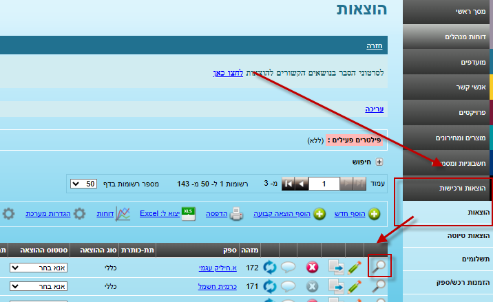 יש להיכנס בלחיצה על אייקון הצפייה שבתחילת שורת ההוצאה הרצויה