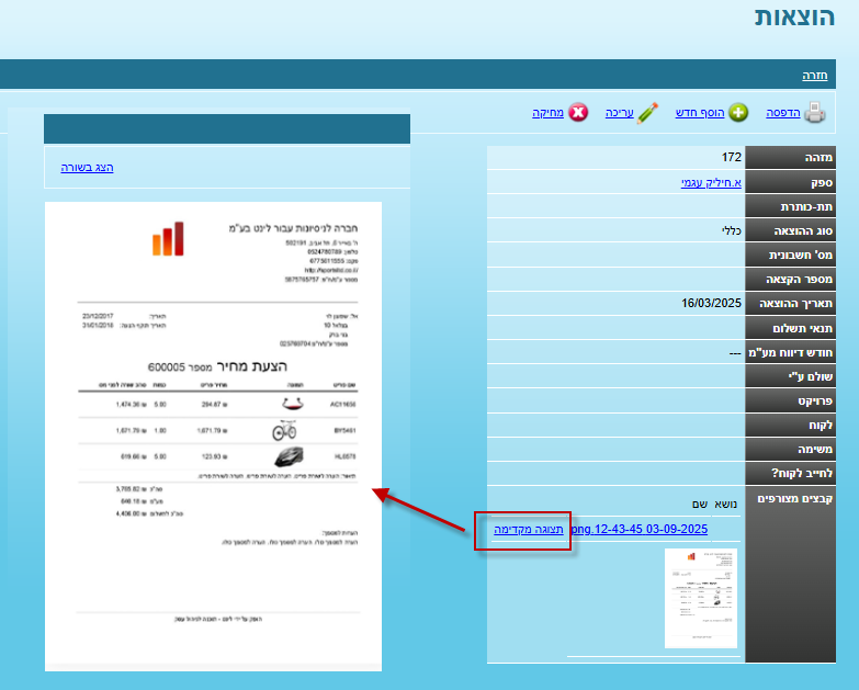 במידה וצרפתם קובץ להוצאה , בעת צפייה בהוצאה - ניתן לבחור ב"תצוגה מקדימה" על מנת לראות את הקובץ שצרפתם.